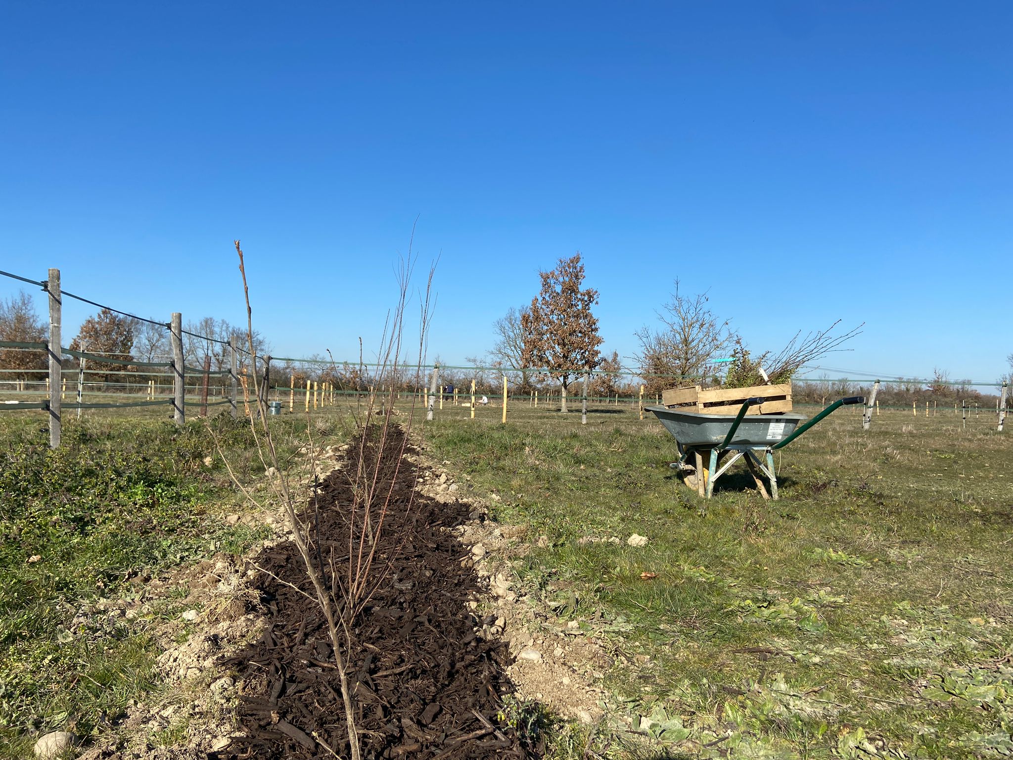 Objectifs du projet : couper le vent et apporter de l'ombre pour le bien-être animal, protéger les prairies pour produire de l'herbe malgré les coups de chaleur fréquents, fournir un habitat pour la biodiversité.